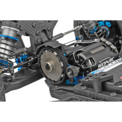 Le nouveau système de transmission 3-gear en position laydown limite les pertes mécaniques et abaisse le centre de gravité. Le pignon intermédiaire de 54 dents sur un axe aluminium de 10 mm, monté sur roulements 10x15mm, garantit une fiabilité extrême et une réactivité immédiate en course. L’ensemble assure une délivrance de puissance linéaire et des températures réduites, parfait pour les courses en catégorie Stock ou Mod.