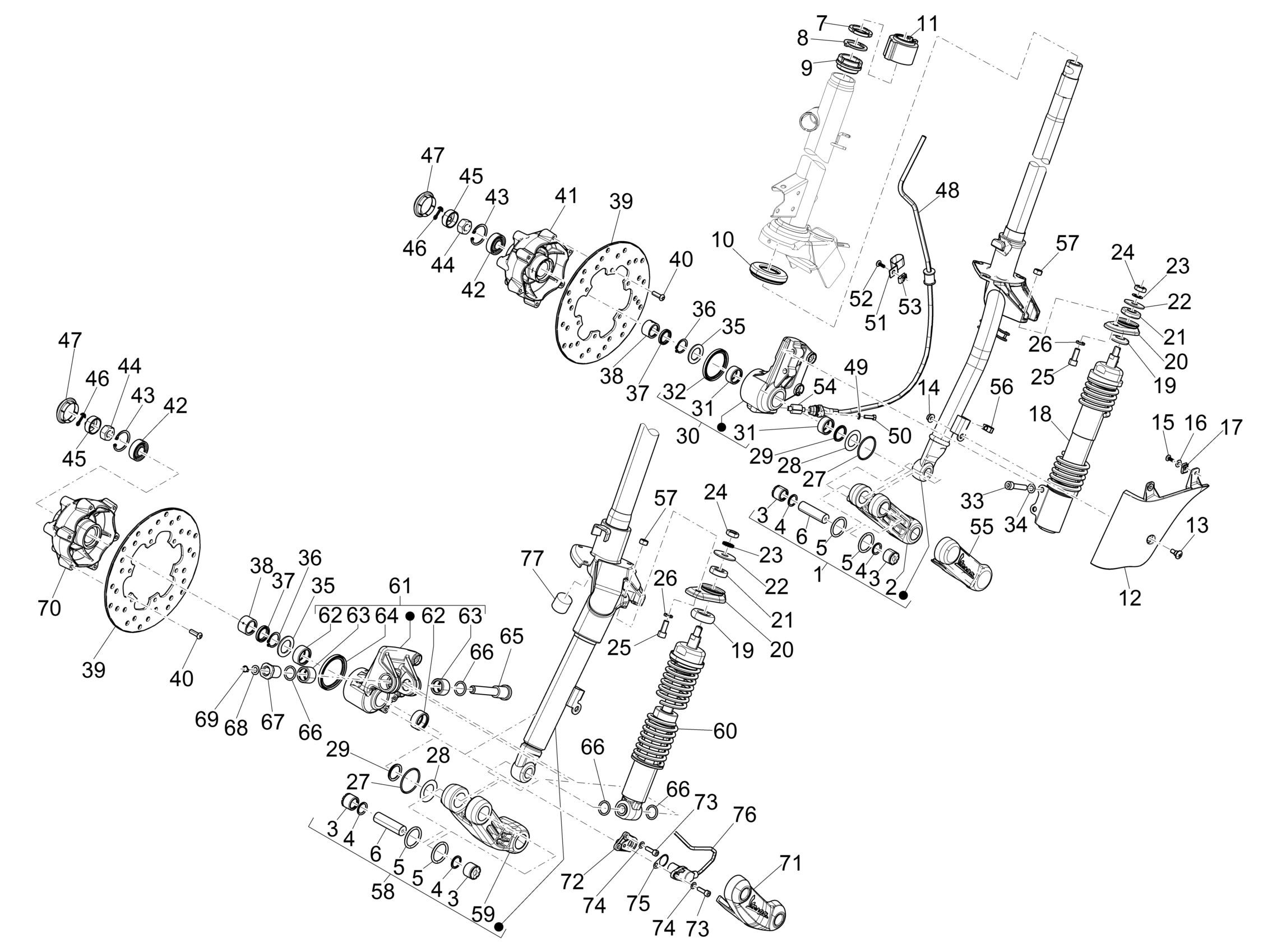 6. Tube et roulements de fourche, amortisseur avant, disque et frein avant