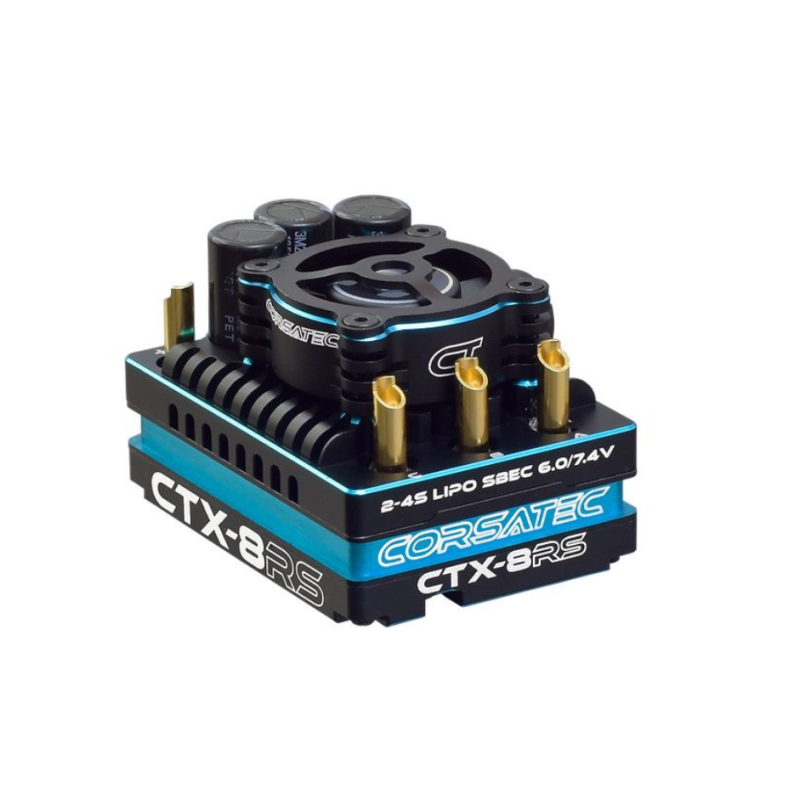 Deze esc 1/8 variator CTX-8RS van Corsatec is ontwikkeld met het oog op prestaties, consistentie en betrouwbaarheid en is voorzien van details zoals 'stealth' kabeltunnels, een lichtgewicht CNC-legering ventilator en een uiterst precieze CNC-behuizing met een laag zwaartepunt. De nieuwe ultralichte, superkoelende ventilator-behuizingcombinatie houdt de bedrijfstemperaturen laag, terwijl XSS-HDT (Xtra Smooth Sensorless Hyper Drive Technology) zorgt voor een perfecte besturing van de Racer onder de meest veeleisende omstandigheden.